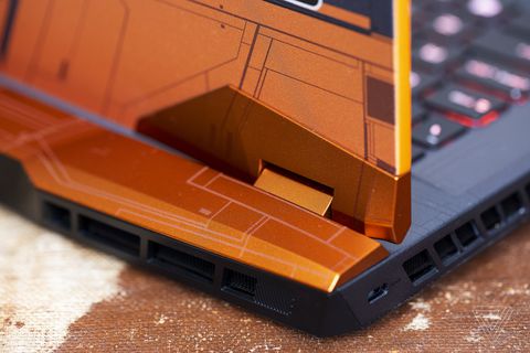 일반 MSI GE66 Raider는 회색 알루미늄 뚜껑과 검은 색 데크가있는 상당히 표준적인 게이밍 노트북 디자인을 가지고 있습니다. 그래서 말 그대로 우주선의 일부처럼 보이는 DragonShield 에디션을 검토하기를 기다렸습니다. 다가오는 Dune, The Mandalorian 및 최근 Star Wars 영화를 작업 한 베테랑 아티스트 Colie Wertz가 디자인했습니다. 이 노트북 전체에 영향을 미치는 것을 볼 수 있습니다. 덮개와 키보드 데크는 모두 생생한 주황색과 검은 색으로 MSI 로고의 공상 과학 렌더링과 복잡한 창 및 구성 요소 격자로 장식되어 있습니다.