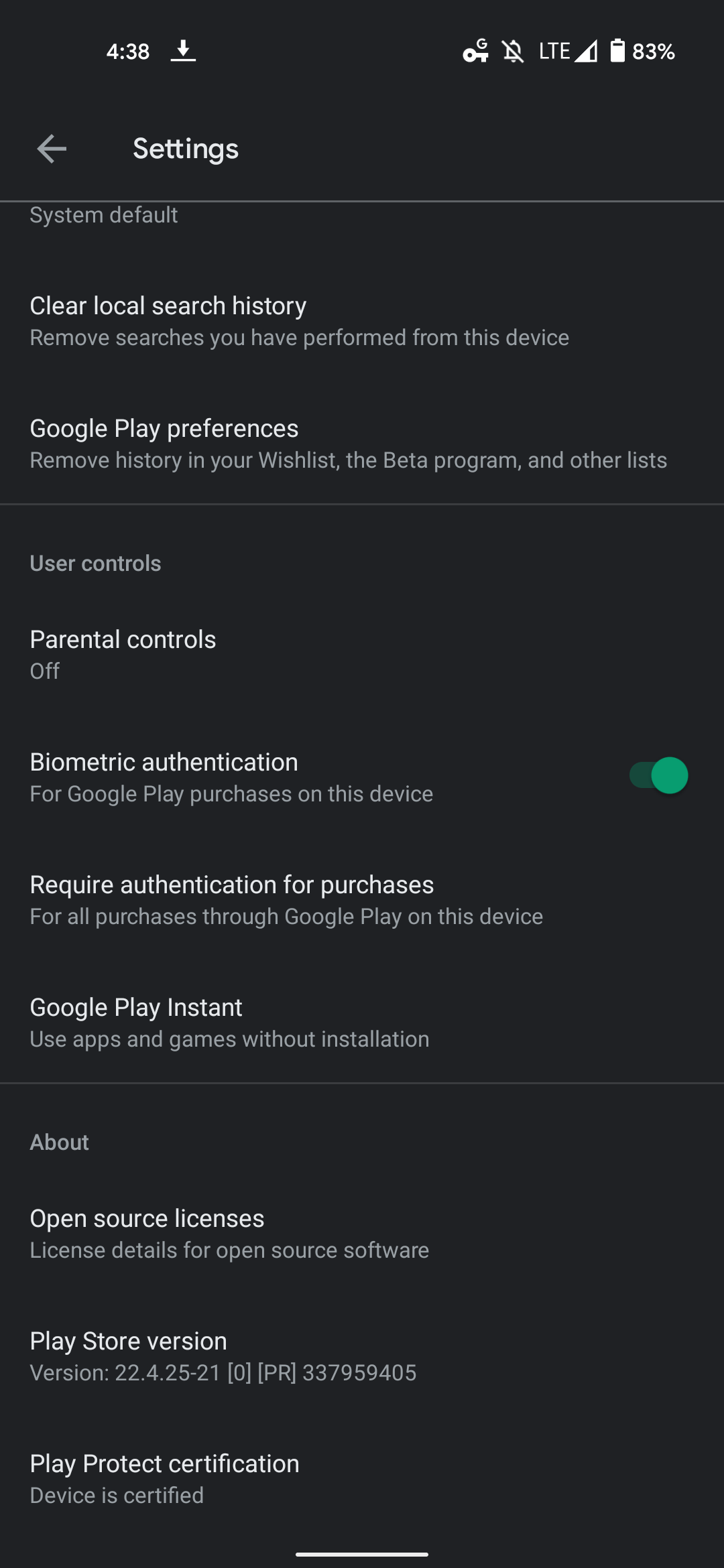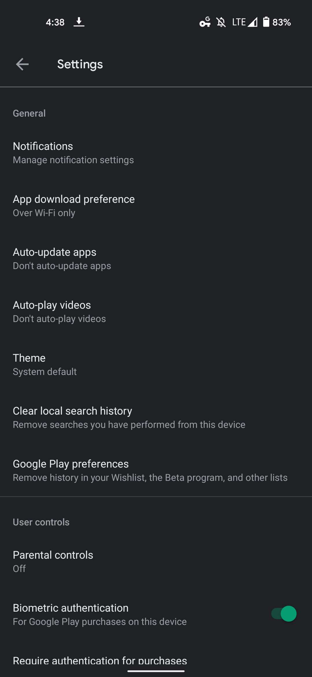 현재 Play 스토어 설정은 다양한 메뉴와 토글을 수용하기 위해 목록을 사용하는 상당히 표준적인 예입니다. 오늘은 일반, 사용자 컨트롤 및 정보의 세 가지 섹션이 있습니다.