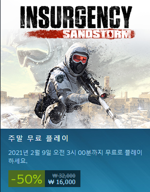 오늘 알려드릴 무료게임은 현재 날짜 2월8일기준 인서줸시(인서겐시) 샌드스톰이라는 게임이 50%로 할인에 12시간 무료플레이로 풀렸기때문에 2021년 2월 9일까지 무료플레이가 가능합니다.