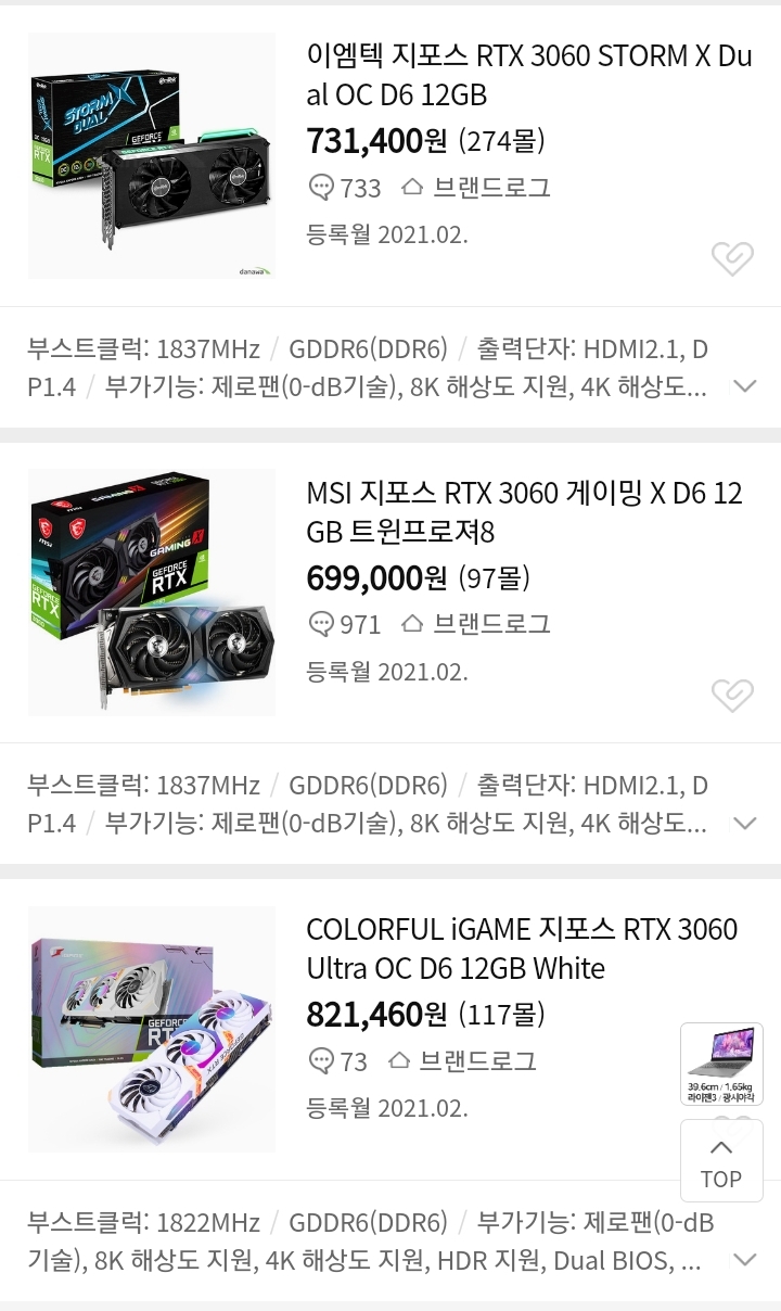 이런식으로 3080가격은 하늘을 뚫은거마냥 비싸고 3060같은 경우에는 아래와같이